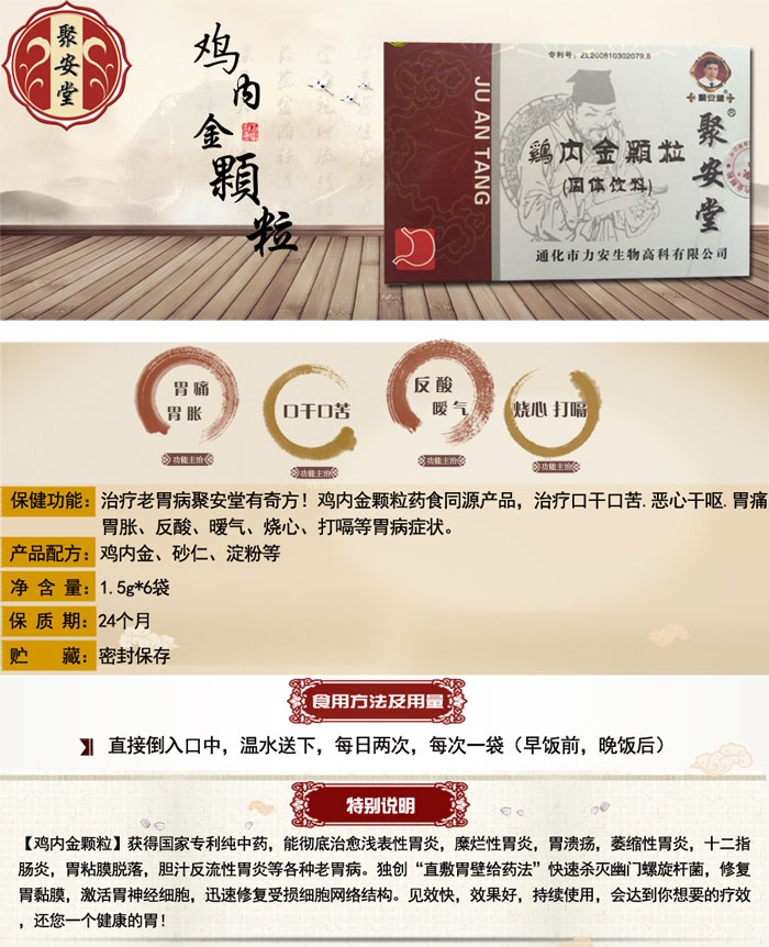 治療老胃病聚安堂有奇方!雞內(nèi)金顆粒藥食同源產(chǎn)品,治療口干口苦.惡心干嘔.胃痛胃脹.反酸.曖氣.燒心.打嗝等胃病癥狀,【雞內(nèi)金顆?!揩@得國(guó)家專利純中藥,能徹底治愈淺表性胃炎,糜爛性胃炎,胃潰瘍,萎縮性胃炎,十二指腸炎,胃粘膜脫落,膽汁反流性胃炎等各種老胃病。獨(dú)創(chuàng)“直敷胃壁給藥法”快速殺滅幽門螺旋桿菌,修復(fù)胃黏膜,激活胃神經(jīng)細(xì)胞,迅速修復(fù)受損細(xì)胞網(wǎng)絡(luò)結(jié)構(gòu)。見(jiàn)效快,效果好,持續(xù)使用,會(huì)達(dá)到你想要的療效,還您一個(gè)健康的胃!